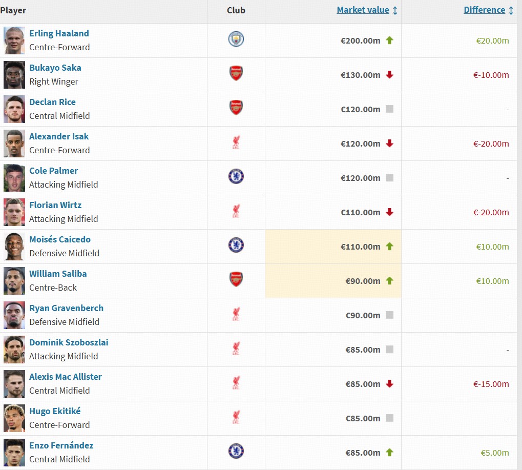 北京時(shí)間12月9日,德轉(zhuǎn)英超球員身價(jià)更新,哈蘭德漲至2億歐,薩卡降至1.3億歐,伊薩克降至1.2億歐