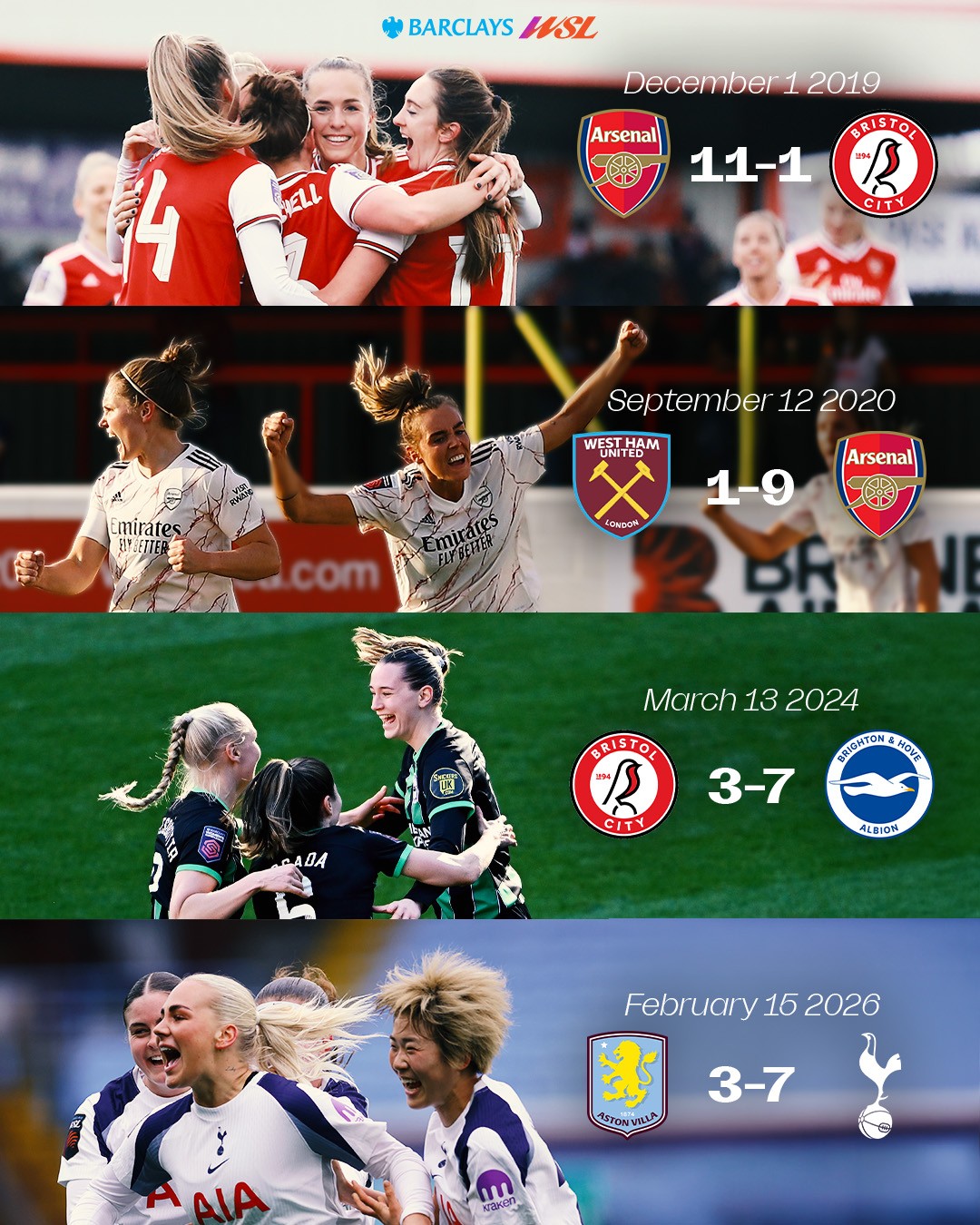 進(jìn)球!進(jìn)球!進(jìn)球!在巴克萊女子超級聯(lián)賽的歷史上,只有四場比賽的單場進(jìn)球數(shù)達(dá)到或超過10個,阿森納女足