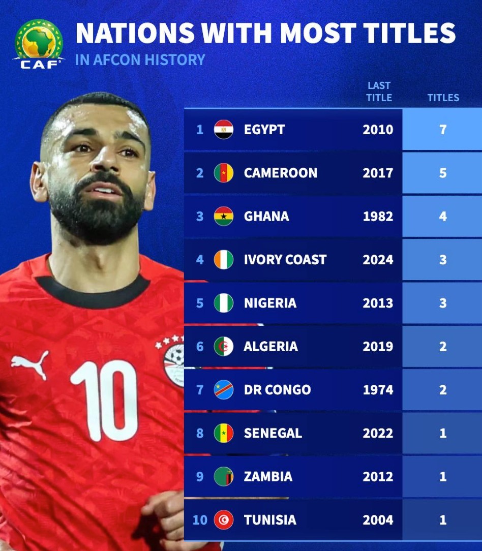 非洲杯奪冠次數(shù)榜:埃及7冠居首,喀麥隆5冠、加納4冠二三位