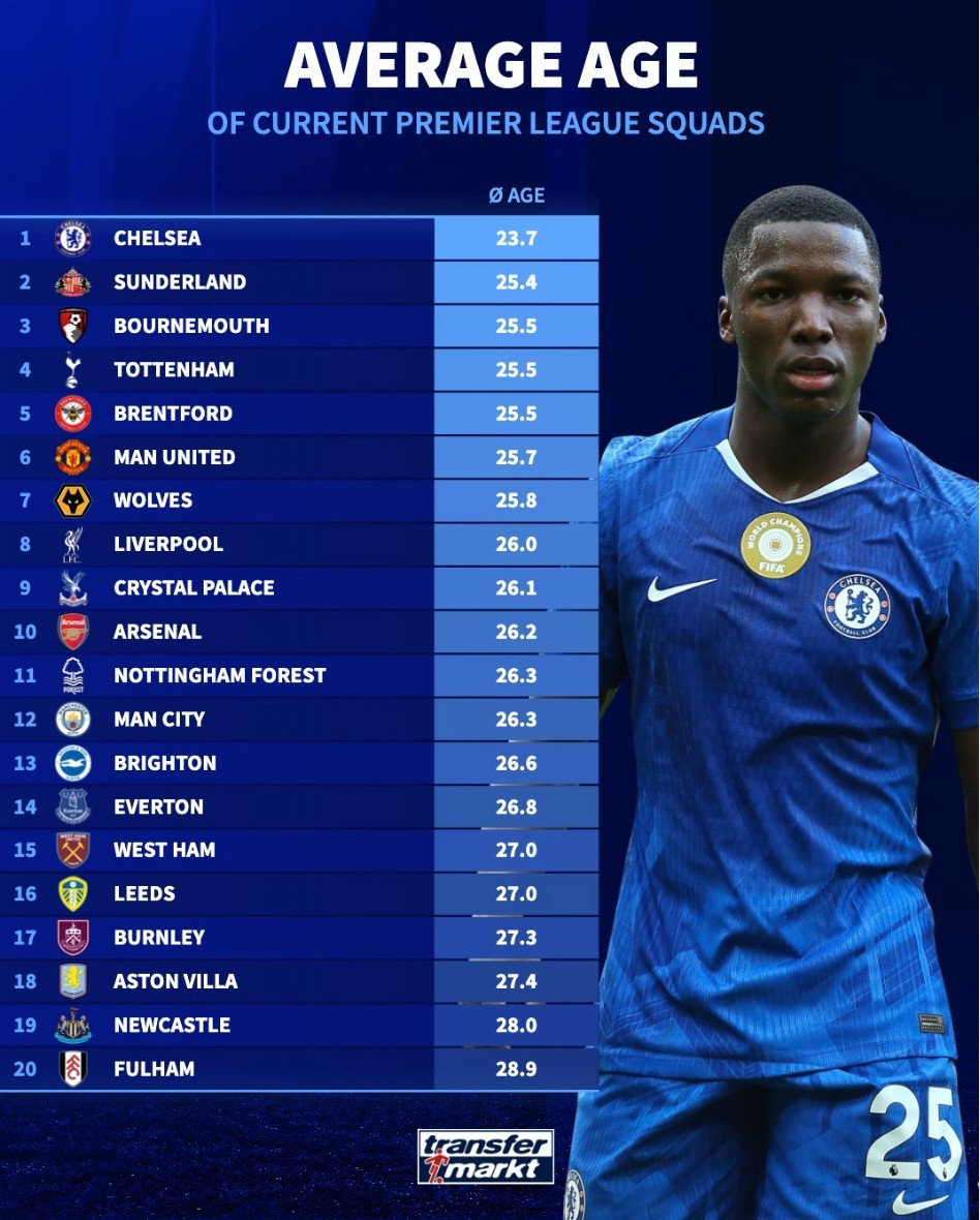 北京時(shí)間1月26日,德轉(zhuǎn)統(tǒng)計(jì)出了本賽季英超20支球隊(duì)的平局年齡,切爾西的現(xiàn)有陣容平均年齡僅為23.7