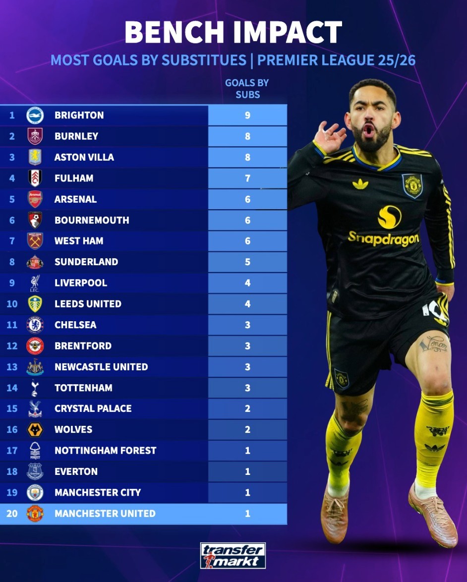 本賽季英超球隊(duì)替補(bǔ)進(jìn)球榜:布萊頓9球第1,曼城、曼聯(lián)1球墊底