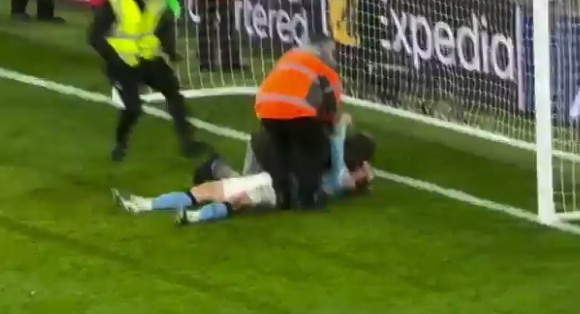 其實我只想安靜地躺會兒,在昨日比賽最后時刻哈蘭德被一球迷緊抱