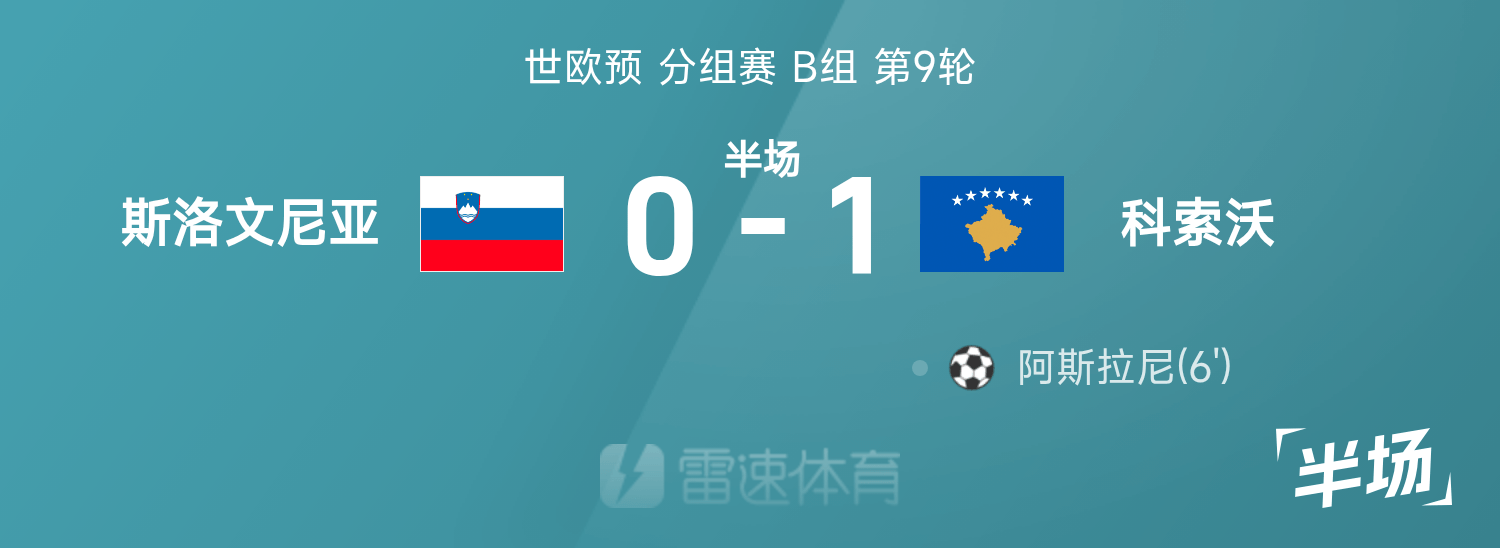雷速體育11月16日訊 26賽季世歐預(yù)分組賽B組第9輪,斯洛文尼亞迎戰(zhàn)科索沃。半場戰(zhàn)罷,雙方比分暫為斯洛文尼亞0-1科索沃,阿斯拉尼破門建功。
