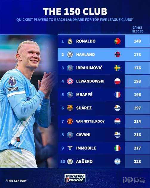 1-1戰(zhàn)平布萊頓的比賽,曼城射手哈蘭德打進1球,這讓他在俱樂部的進球數(shù)達到150球。德國轉(zhuǎn)會市場盤點了5大聯(lián)賽最快達成150球里程碑的球員,C羅149場居首,哈蘭德173場次之。