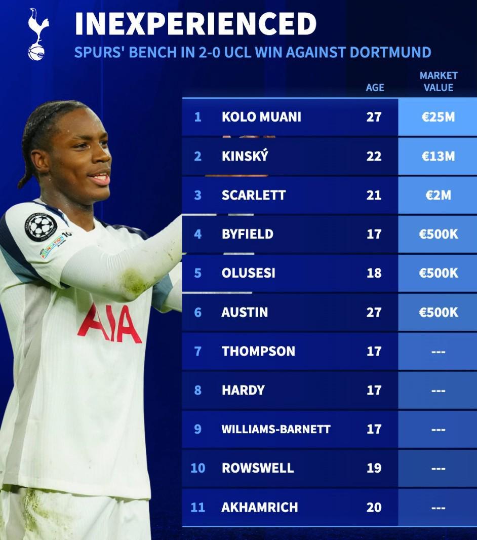 德轉(zhuǎn)的統(tǒng)計(jì)同時(shí)指出,在歐冠聯(lián)賽階段第7輪熱刺主場(chǎng)2-0擊敗多特蒙德的比賽中,熱刺替補(bǔ)席上的11名球員中有5人甚至在德轉(zhuǎn)上都沒(méi)有身價(jià),剩余6人總身價(jià)也僅為4150萬(wàn)歐元。