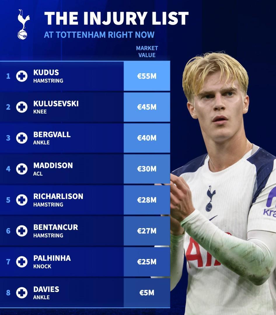北京時(shí)間1月23日,在盧卡斯-貝里瓦爾腳踝受傷可能缺陣長(zhǎng)達(dá)3個(gè)月之后,德轉(zhuǎn)列出了托特納姆熱刺目前的傷病名單,8名因傷高掛免戰(zhàn)牌的球員總身價(jià)達(dá)到了2.55億歐元。