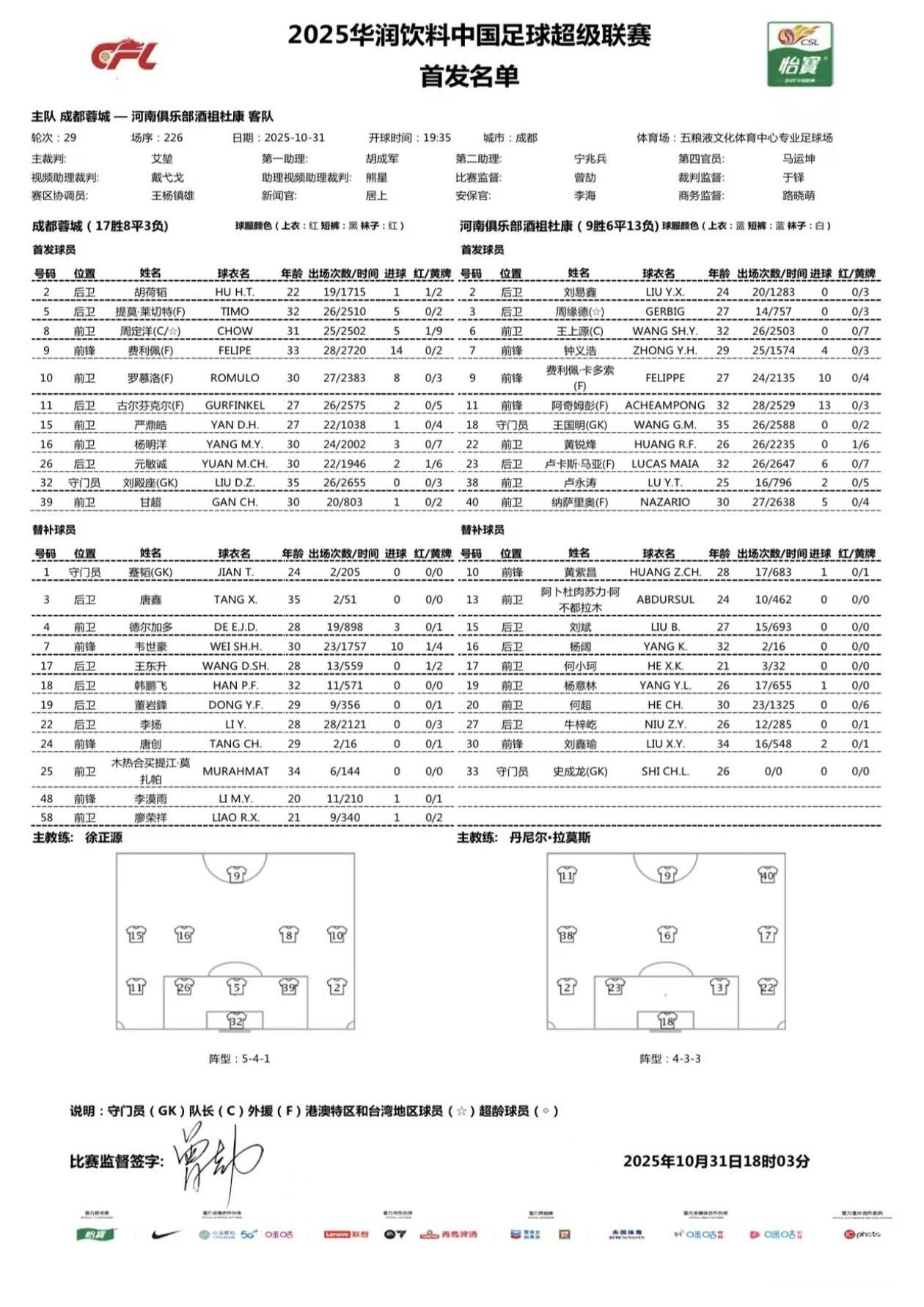 北京時(shí)間10月31日19:35,中超第29輪成都蓉城將坐鎮(zhèn)主場(chǎng)迎戰(zhàn)河南建業(yè),艾堃出任本場(chǎng)主裁判。雙方賽前公布首發(fā)名單。