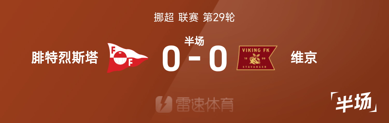 雷速體育11月24日訊 25賽季挪超聯(lián)賽第29輪,腓特烈斯塔迎戰(zhàn)維京。半場(chǎng)戰(zhàn)罷,雙方比分暫為腓特烈斯塔0-0維京。