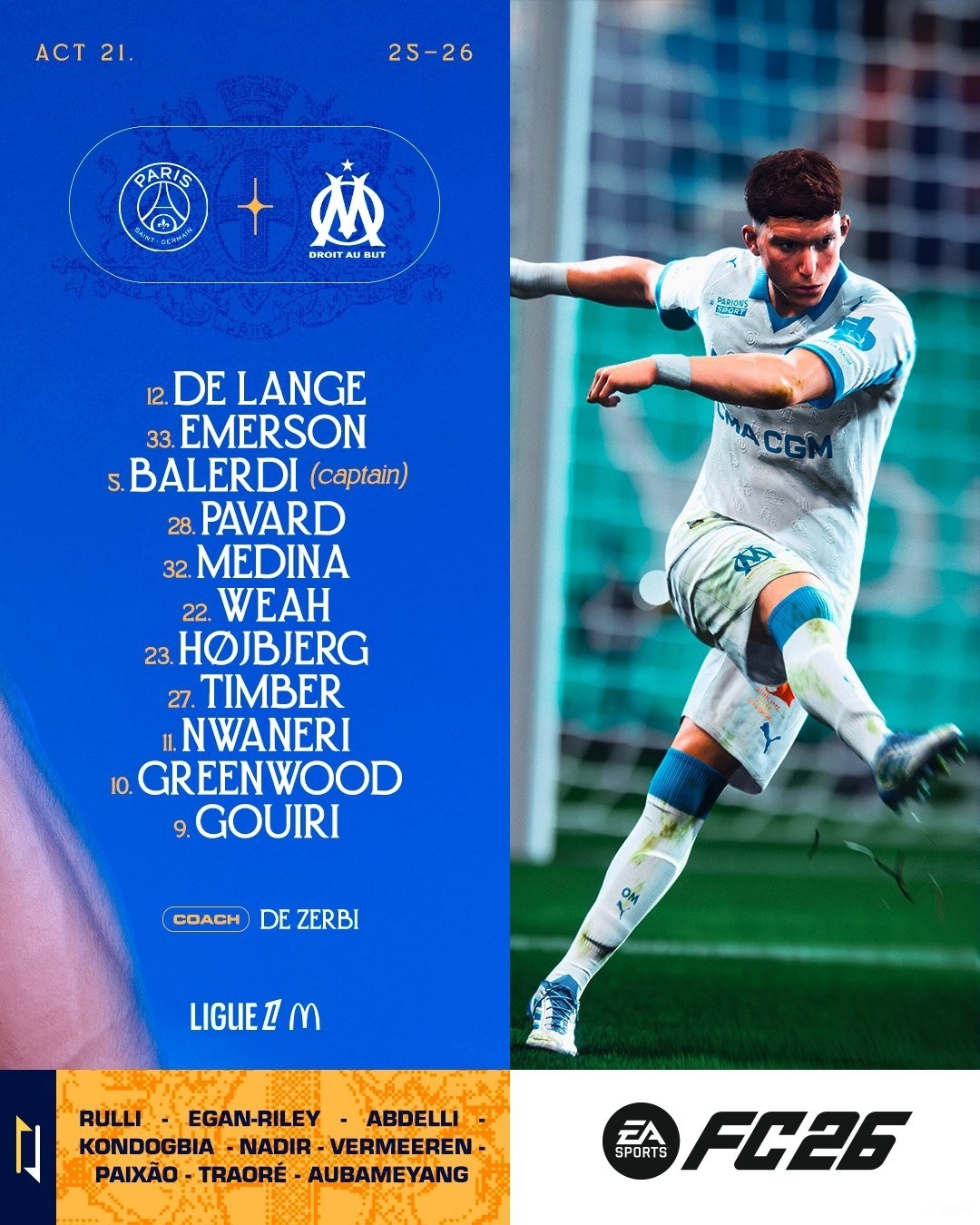 馬賽首發(fā):12-德朗格、32-梅迪納、5-巴列爾迪、28-帕瓦爾、33-埃莫森、23-赫伊別爾、27-昆滕-廷貝爾、22-蒂莫西-維阿、10-格林伍德、11-恩瓦內(nèi)里、9-古伊里
