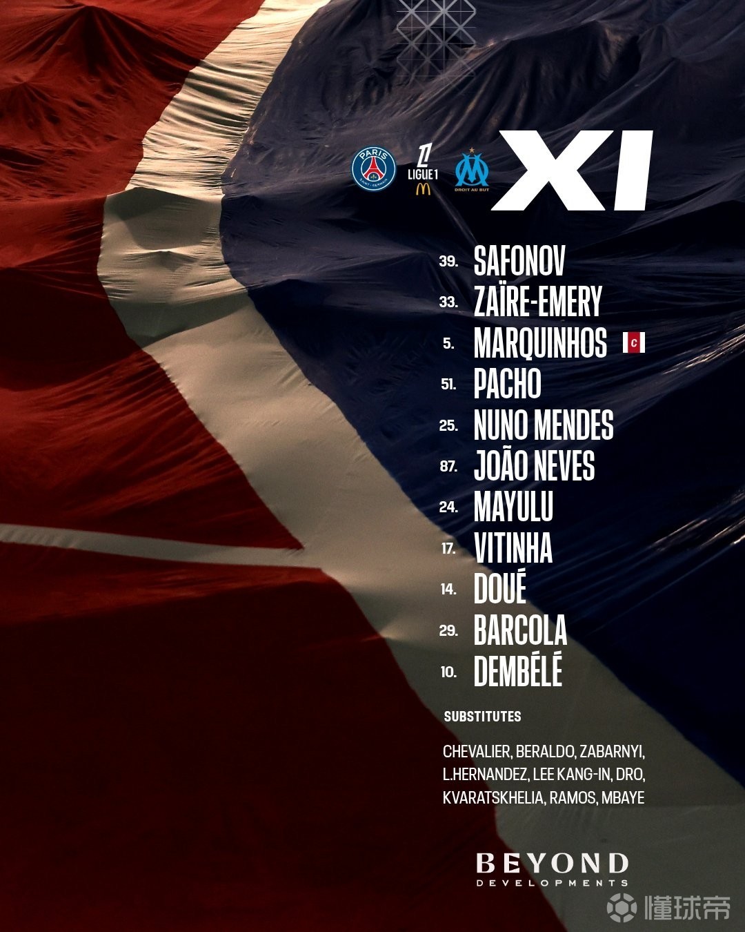 巴黎首發(fā):39-薩福諾夫、25-門德斯、5-馬爾基尼奧斯、51-帕喬、33-扎伊爾-埃梅里、17-維蒂尼亞、87-若昂-內(nèi)維斯、24-馬尤盧、10-登貝萊、14-杜埃、29-巴爾科拉