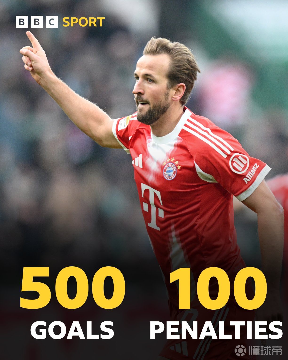 凱恩職業(yè)生涯已攻入500個(gè)進(jìn)球,其中100個(gè)點(diǎn)球