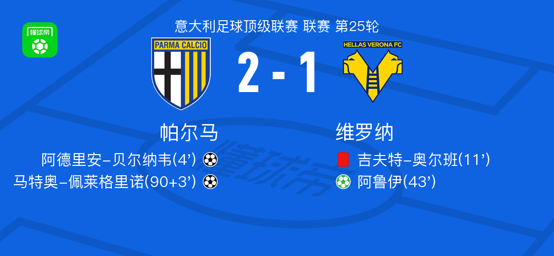 北京時間2月15日意大利足球頂級聯(lián)賽第25輪,帕爾馬主場對陣維羅納。比賽中,帕爾馬球員率先通過配合由阿德里安-貝爾納韋打入一球;隨后維羅納球員吃到紅牌,球隊陷入被動;半場結(jié)束前,維羅納依靠點球由阿魯伊扳回一球;下半場補時階段,帕爾馬再次通過配合由馬特奧-佩萊格里諾破門鎖定勝局。最終比分帕爾馬2-1維羅納。