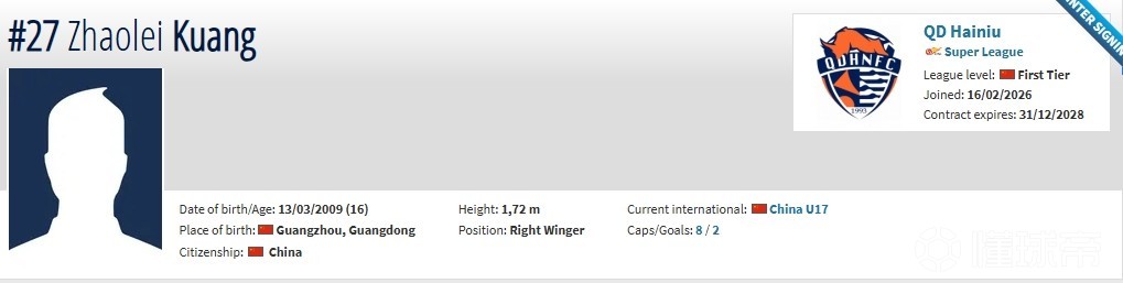 北京時(shí)間2月16日,德轉(zhuǎn)更新,16歲前鋒鄺兆鐳自由身加盟青島海牛,雙方簽約3年。
