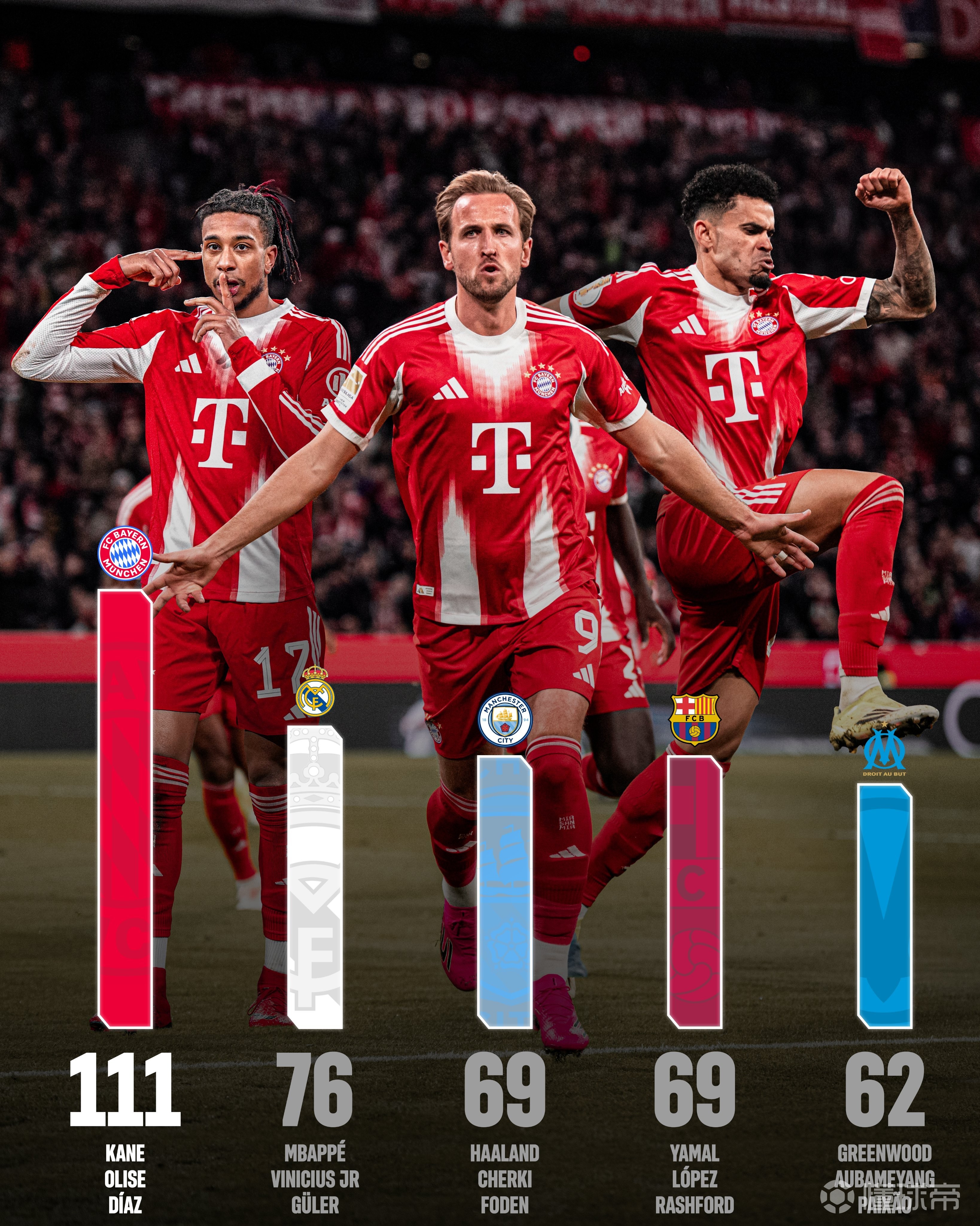賽季至今,凱恩貢獻(xiàn)41球5助攻,迪亞斯19球12助攻,奧利塞13球21助攻,三人參與進(jìn)球數(shù)合計(jì)為111球(不過這不代表三人共制造111球,其中包括彼此的助攻與進(jìn)球)。