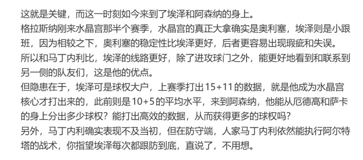 所以從這個(gè)角度來(lái)說(shuō),阿森納當(dāng)然可以覺(jué)得自己很倒霉,這一點(diǎn)也的確是事實(shí),包括埃澤的防區(qū)丟球,也是新援加盟,來(lái)到新位置需要交的學(xué)費(fèi),但在這些事情之外,阿森納也需要觀察一下自己的戰(zhàn)術(shù)流暢度。