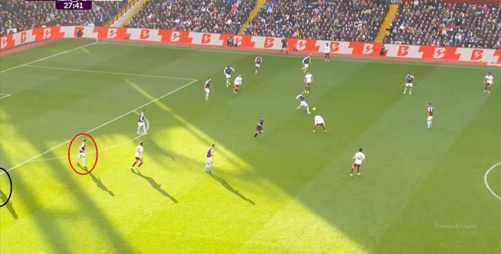 所以在第28分鐘,阿斯頓維拉完成搶斷之后,發(fā)動(dòng)了左路的進(jìn)攻,一腳傳中打到禁區(qū)內(nèi),便來(lái)到了后點(diǎn)的卡什腳下: