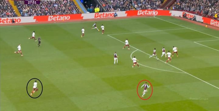 另外,阿斯頓維拉通過(guò)長(zhǎng)傳球,也能繞過(guò)逼搶和中場(chǎng),直接從前場(chǎng)打出攻勢(shì):