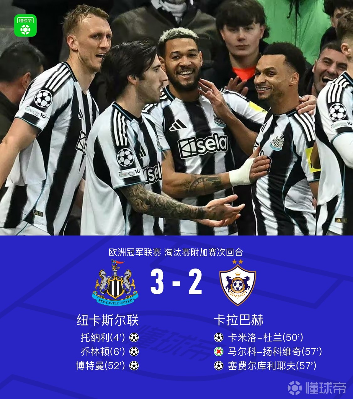 北京時間2月25日歐洲冠軍聯(lián)賽 淘汰賽附加賽次回合,紐卡斯爾聯(lián)對陣卡拉巴赫。紐卡斯爾聯(lián)托納利破門,喬林頓破門,博特曼破門。卡拉巴赫卡米洛-杜蘭破門,塞費爾庫利耶夫破門。最終比分紐卡斯爾聯(lián) 3-2 卡拉巴赫。兩回合總比分紐卡斯爾聯(lián)9-3卡拉巴赫。