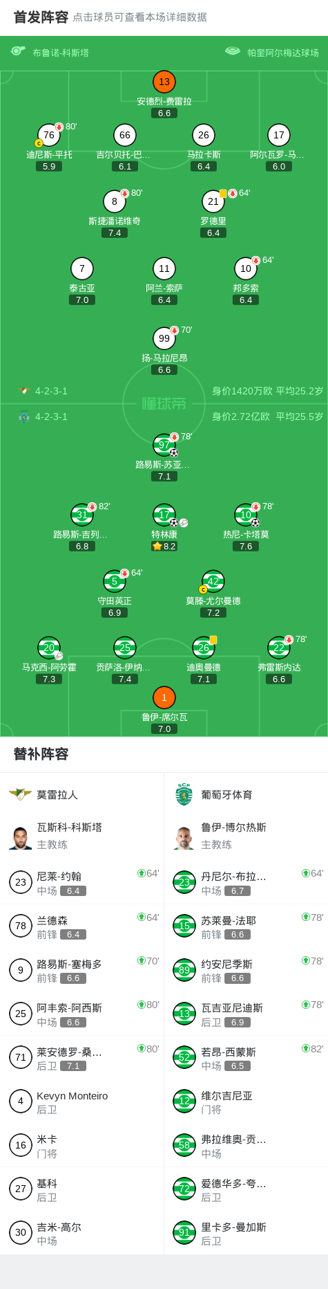 第56分鐘,葡萄牙體育球員特林康助攻熱尼-卡塔莫打入一球。