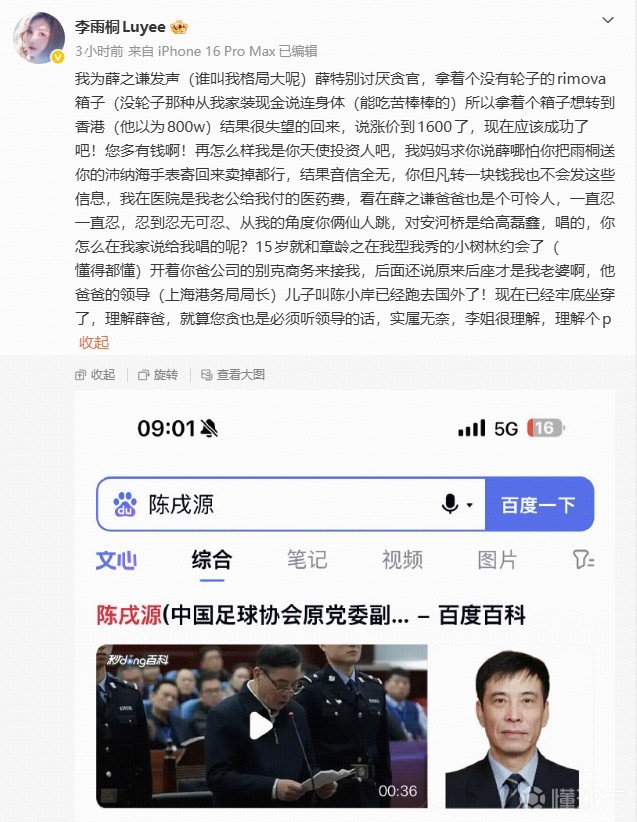 近日,內(nèi)娛關(guān)于李雨桐和薛之謙的話題頻頻上熱搜,兩人曾是情侶關(guān)系,但分手并不體面。李雨桐這兩天連續(xù)更博喊話薛之謙,今天她的一條內(nèi)容意外出現(xiàn)了中國足協(xié)前主席陳戌源的名字。