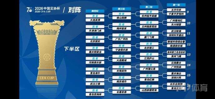 026年足協(xié)杯1-4輪抽簽出爐,今年恰逢足協(xié)杯70周年,一共80隊參賽。中甲球隊第三輪登場,中超球隊第四輪登場。1-4輪比賽90分鐘內(nèi)打平直接進行點球大戰(zhàn),第4輪結(jié)束之后將進行第二次抽簽。