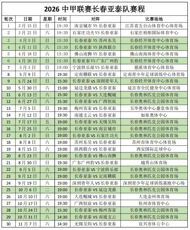 長(zhǎng)春市因承辦2027年第33屆世界大學(xué)生冬季運(yùn)動(dòng)會(huì),長(zhǎng)春體育中心體育場(chǎng)(南嶺)將進(jìn)行施工改造。長(zhǎng)春亞泰新賽季前4個(gè)主場(chǎng)將移至長(zhǎng)春經(jīng)開(kāi)體育中心體育場(chǎng)。6月13日開(kāi)始,其余11個(gè)主場(chǎng)將在長(zhǎng)春奧林匹克公園體育場(chǎng)進(jìn)行。