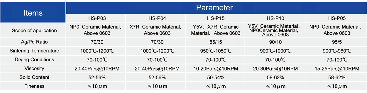 Silver-Palladium Paste is applied to the internal electrode printing of MLCC products. It features good dispersion without agglomeration; excellent printing characteristics without erosion to the dielectric layer; strong adhesion that effectively solves the cracking problem caused by the paste; and a flat and continuous metal layer after sintering. It does not contain harmful substances such as Pb, Cd, etc. (meets RoHS 2.0 requirements), and can be customized with different silver-palladium ratios based on customer needs.