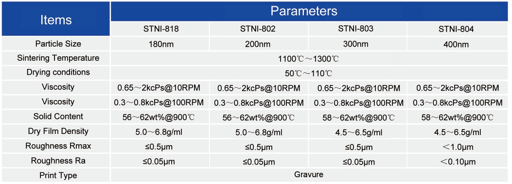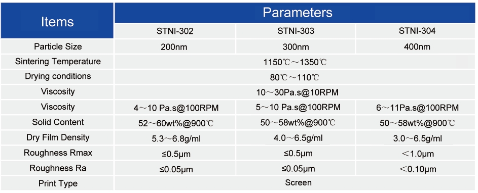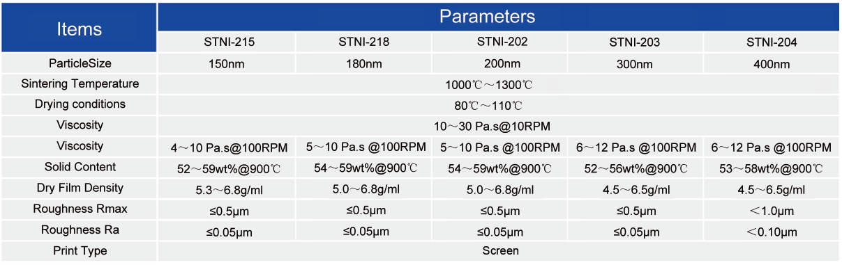 This series of products is applicable to the production of MLCC products. Nano-sized nickel powder is easy to agglomerate and the internal electrode is easy to appear electrode discontinuity and unevenness after sintering, therefore the nickel paste with good dispersion and stability has been developed. It shows good adhesion with the dielectric layer after stacking and good electrode continuity and flatness after sintering, it also greatly improves the reliability and compressive strength of MLCC components. The shrinkage matching, crack, yield and reliability can be improved by adjusting the additives.