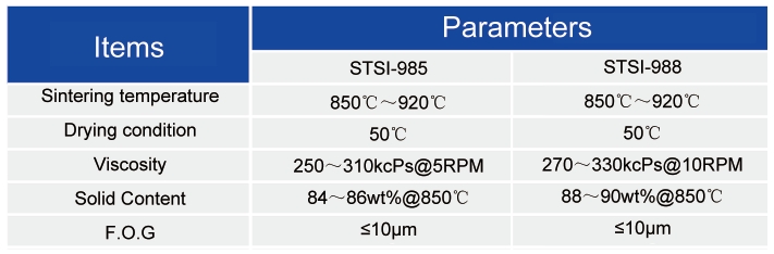 STSI-985/988 is used for internal electrodes and magnetic beads of laminated inductors, especially for high-power inductors. This product is mainly composed of silver powder, glass powder, polymer resin, organic solvent, additive and so on. Excellent printability, suitable for printing conditions of different rates, excellent electrical performance. It does not contain Pb, Cd and other harmful elements (In accordance with RoHS 2.0 requirements).