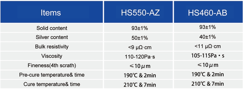 HS550-AZ and HS460-AB are silver-coated copper fine grid pastes designed for the front and back of heterojunction solar cells, respectively. They provide excellent printing performance and fine grid lines with a high aspect ratio. The modules manufactured using these two pastes exhibit reliable performance. With a respective silver content of 50% and 40%, these pastes can effectively meet customers' cost reduction requirements.