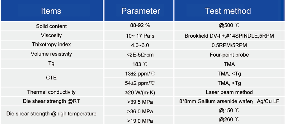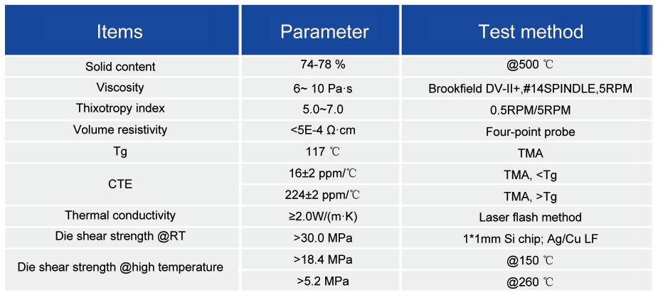 It has high thermal conductivity, high electrical conductivity and high reliability. In addition, high-temperature adhesion of the paste is excellent. This paste suits dispensing process.