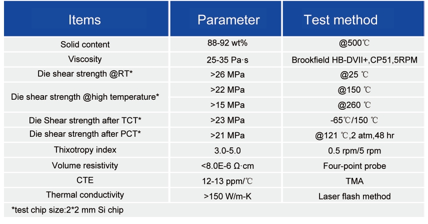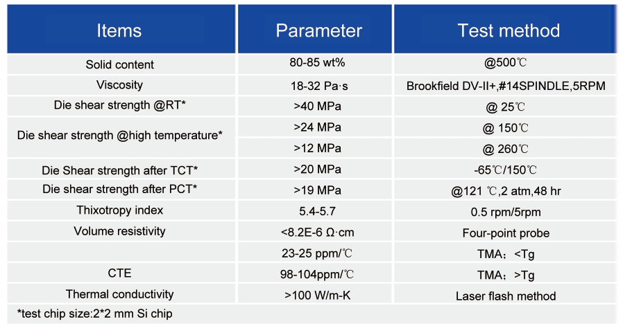 It can be used for high power modules (such as IGBT) packaging. It has high thermal conductivity, high electrical conductivity and high reliability. Excellent rheological properties make it suitable for the printing process. It supports no pressure or pressure rapid sintering process. The maximum bonding wafer size is 12mm*12mm.