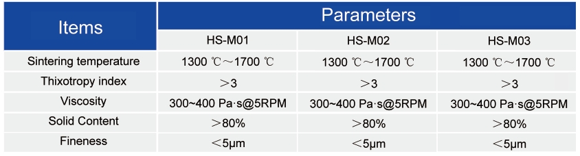(1)HS-M01 is a screen-printed thick film conductor paste for the fabrication of metal electrodes, designed for surface metallization of alumina substrates or in high-temperature co-fired ceramic processes.