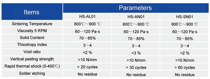 (2)HS-AN01 is a specialized active metal brazing (AMB) paste formulated for use with copper cladding on AlN substrates.