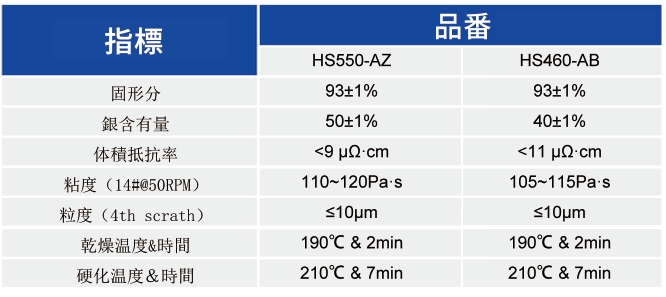 HS550-AZとHS460-ABは、それぞれヘテロ接合型セルの表面と裏面に使用される銀コート銅ペーストです。印刷特性に優(yōu)れ、高アスペクト比の細(xì)線グリッド電極が形成できます。これら2種のペーストを応用したモジュールは、高い信頼性を有します。 銀含有量はそれぞれ50%、40%であり、顧客のコスト削減ニーズに十分対応できます。