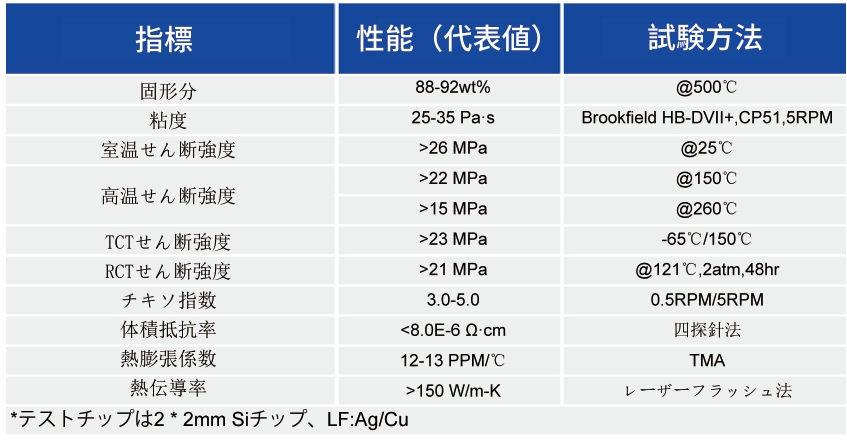 HS-401は、高出力IGBTなどの高出力チップ実裝用のナノ焼結(jié)銀ペーストです。このペーストは高熱伝導(dǎo)性、高導(dǎo)電性、高信頼性を有し、印刷プロセスに適した?jī)?yōu)れたレオロジー特性を有しています。無(wú)加圧または加圧による急速焼結(jié)プロセスにも適用できます。最大で12mm * 12mmの大型ウェハーまで実裝可能です。